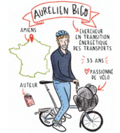 Aurélien Bigo, portrait dessiné d’un scientifique passionné de vélo. Aurélien Bigo est chercheur sur la transition énergétique des transports. Il a soutenu en 2020 sa thèse à l’Institut Polytechnique de