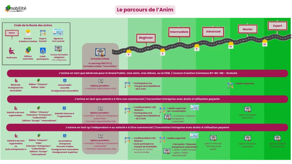 Vous avez participé à un atelier et vous avez adoré. À tel point que cela vous a donné envie à vous aussi de transmettre les messages de la Fresque de la Mobilité. Découvrez ci-dessous les parcours que nous vous proposons, adaptés à votre situation.