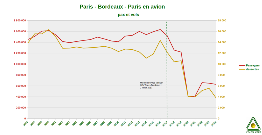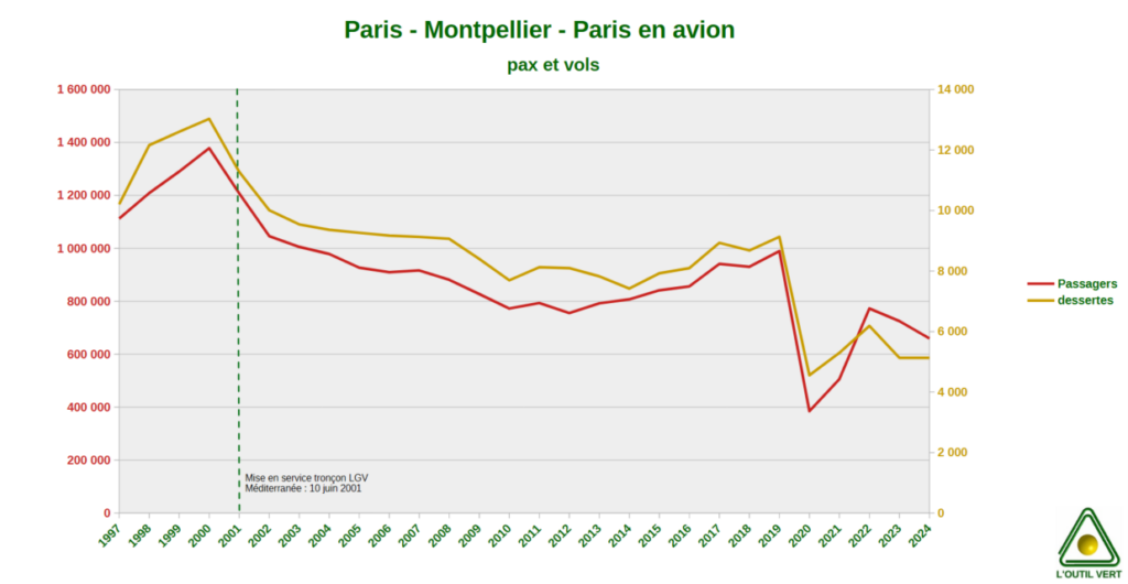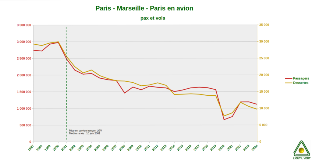 Corrélation et causalité sont 2 notions différentes. Quand on met côte-à-côte les évolutions du transport aérien et les aménagements de LGV, une tendance semble se dégager.