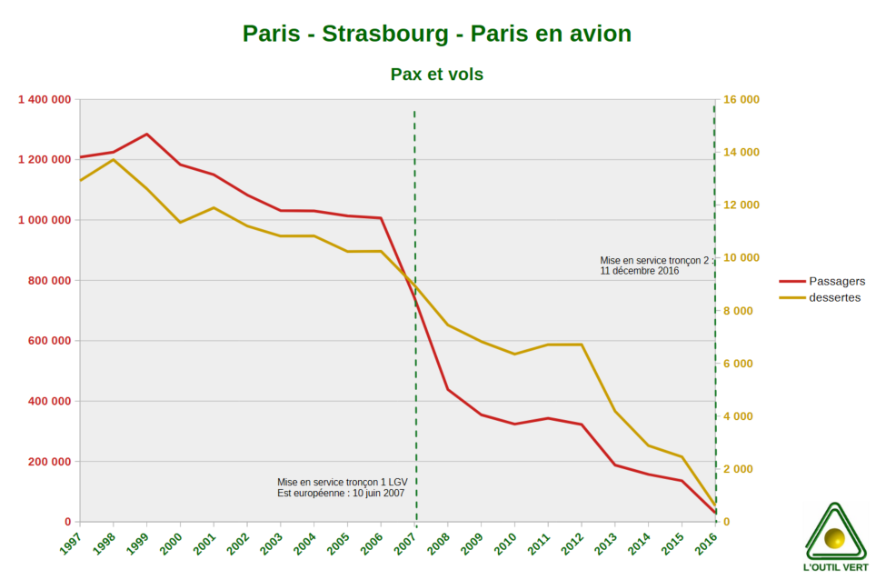 Le même raisonnement s’applique si la mise en place d’une LGV concerne une liaison qui ne disposait d’aucun tronçon de ce type (Paris – Strasbourg en l’occurrence avec la LGV Est européenne). Pour cette dernière, il n’existe désormais plus de liaison Paris-Strasbourg en avion depuis 2016…